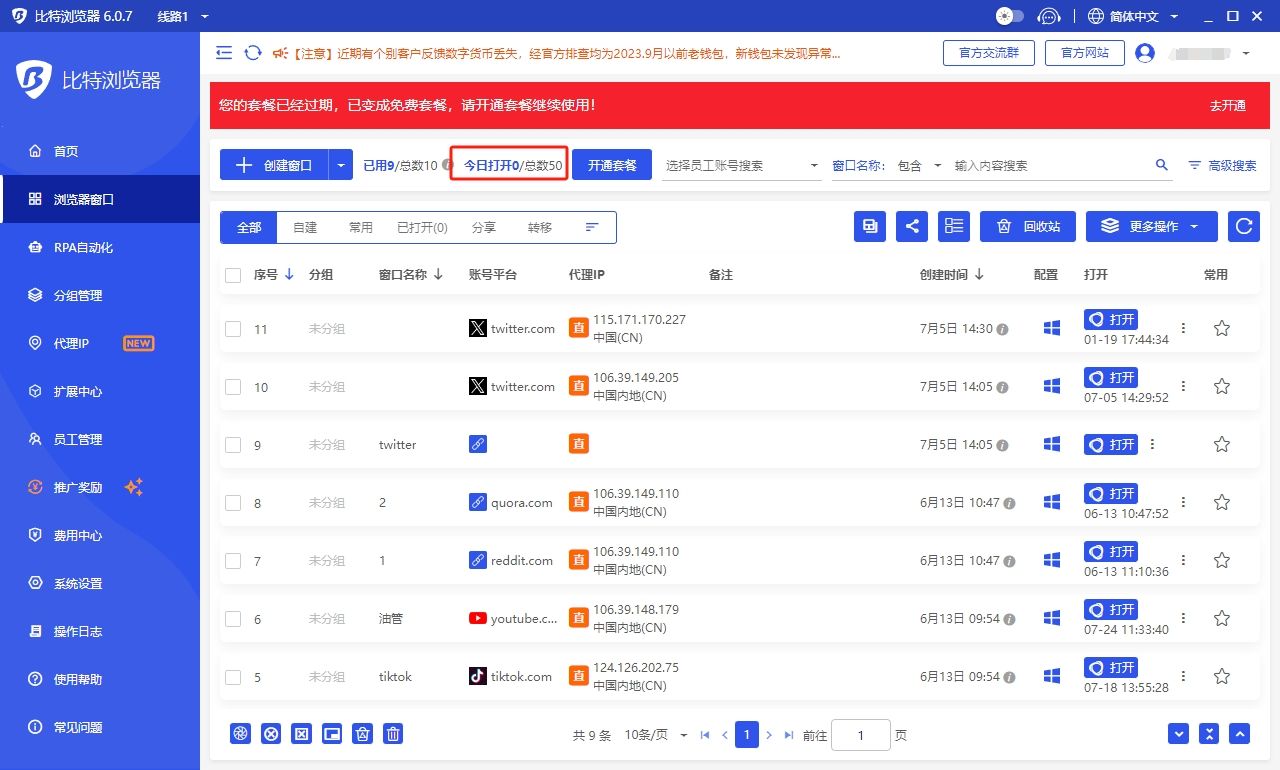 对于有更多打开窗口需求的比特浏览器用户,可以采用更高级的套餐来避免打开比特浏览器窗口数不够用的情况出现,比特浏览器的基础款付费套餐就提供有500次的窗口打开数量,次日就可以刷新,基本可以满足普通用户的需求。