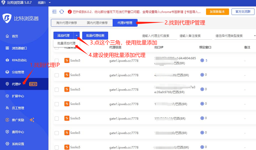 第2步:登录比特浏览器, 找到”代理IP”按钮,如下图所示: