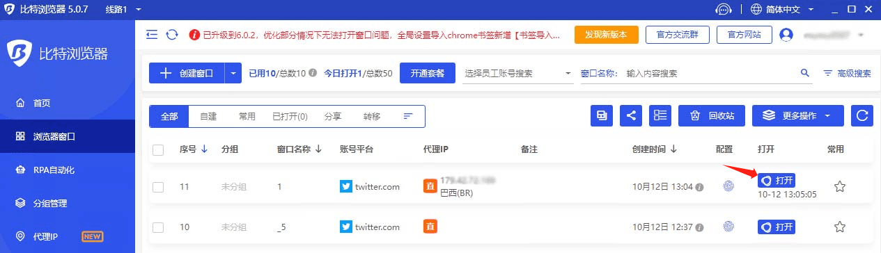 第6步:在“浏览器窗口”页面,看到刚刚配置的窗口,点击“打开”按钮,即可使用ipweb代理访问网站!