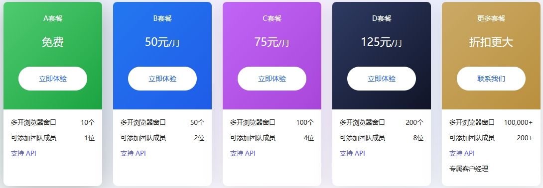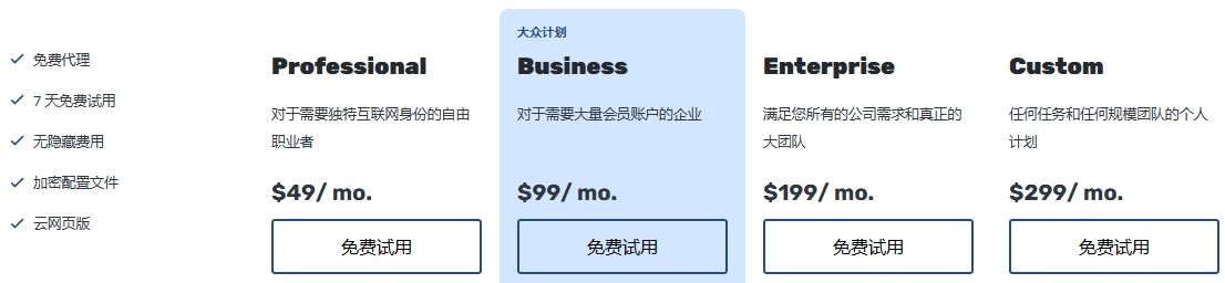 仅限 3 个浏览器配置文件的免费套餐 免费试用,完全访问权限 – 7 天 100 个配置文件– 49 美元/月≈350元/月(无团队成员) 300 个配置文件– 99 美元/月≈700元/月(10团队成员) 1000 个配置文件– 199 美元/月≈1400元/月(20团队成员) |
