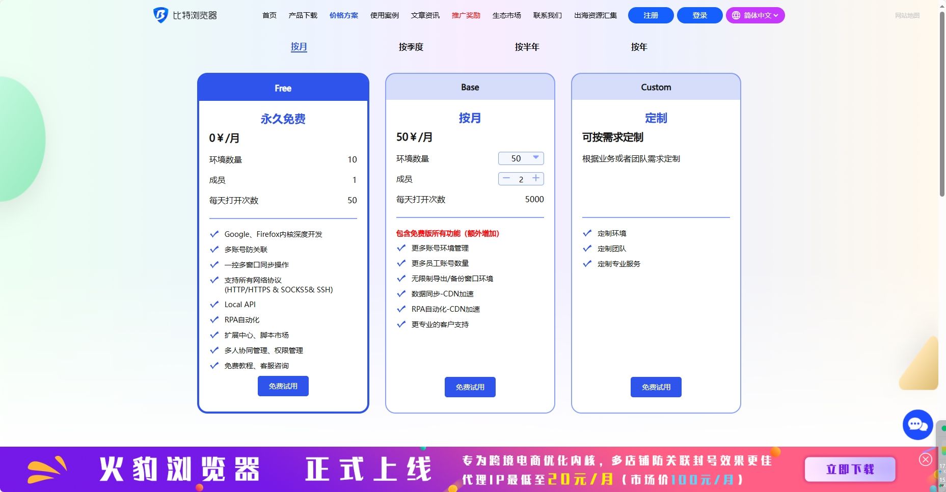比特浏览器提供免费版本和付费版本,免费版本提供基础功能以及永久免费的10个窗口,付费版本则提供更多高级功能和窗口,例如更多的窗口配置文件,子账户等,比特浏览器的性价比在防检测浏览器中堪称最佳,无论你是初步接触防检测浏览器浏览器还是一个长期试用的老手,比特浏览器都是你最好的选择之一,即便是免费的版本,在比特浏览器你也可以获得完整的使用体验,为每个用户提供最佳的产品,点击访问比特浏览器定价方案。