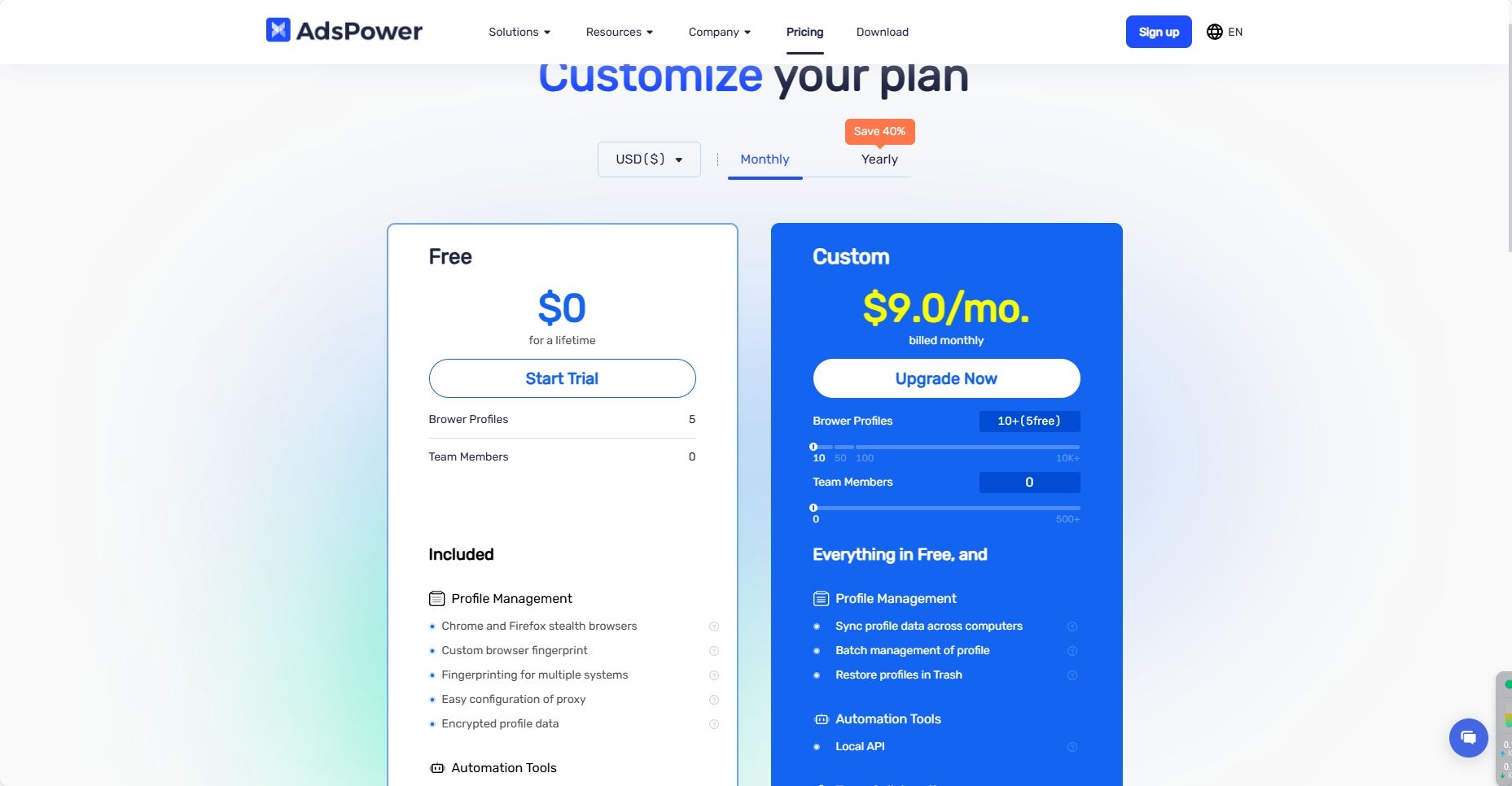 Adspower 有提供免费套餐,不过该套餐仅含有两个免费配置文件,若要解锁更多数量的配置文件以及员工席位就得购买其套餐,而且若需使用自动化服务还需额外支付费用,价格是 10 美元起,同时也提供免费试用,Adspower的付费套餐有灵活的选择模式,可以根据你需要的窗口数量和子账户数量及功能进行付费,但其价格总体而言是比价偏贵的。