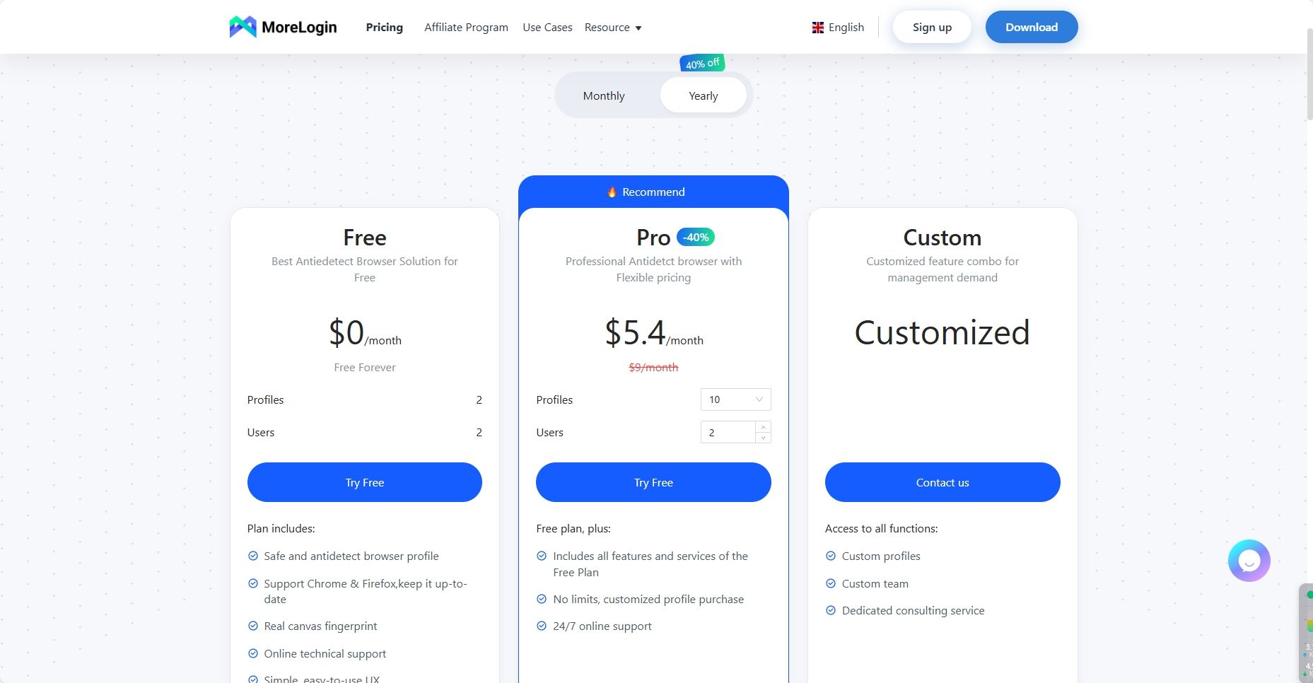 Morelogin 提供了三种套餐类型,即免费版、Base 版和定制版。免费版可允许您创建 2 个浏览器环境和 2 个用户,能提供一些基本功能。倘若您有更多的需要,您可以选取 Base 版套餐,其最低价格为每月 9 美元,包含 10 个浏览器环境和 2 个用户,在功能上没有限制。至于定制版套餐,您需要和 Morelogin 团队取得联系,以获得更多详尽的信息。