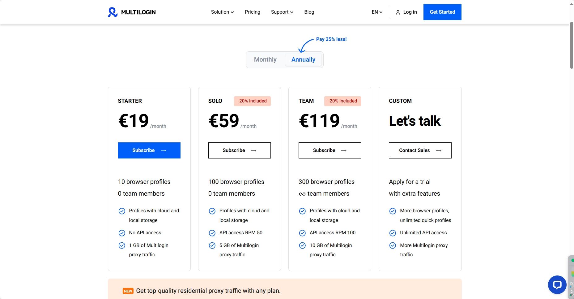 Multilogin 很可能是市场中防检测浏览器里价格最为高昂的。其最便宜的套餐每月起始价格为 115 美元,其中涵盖了 100 个配置文件,不过并不包含协作功能。倘若所需要的配置文件数量较少或者自身预算有限的话,那可能就需要去寻找其他的选项了。其价格的起步为 115 美元,而在试用方面,则需要联系客服来进行申请。