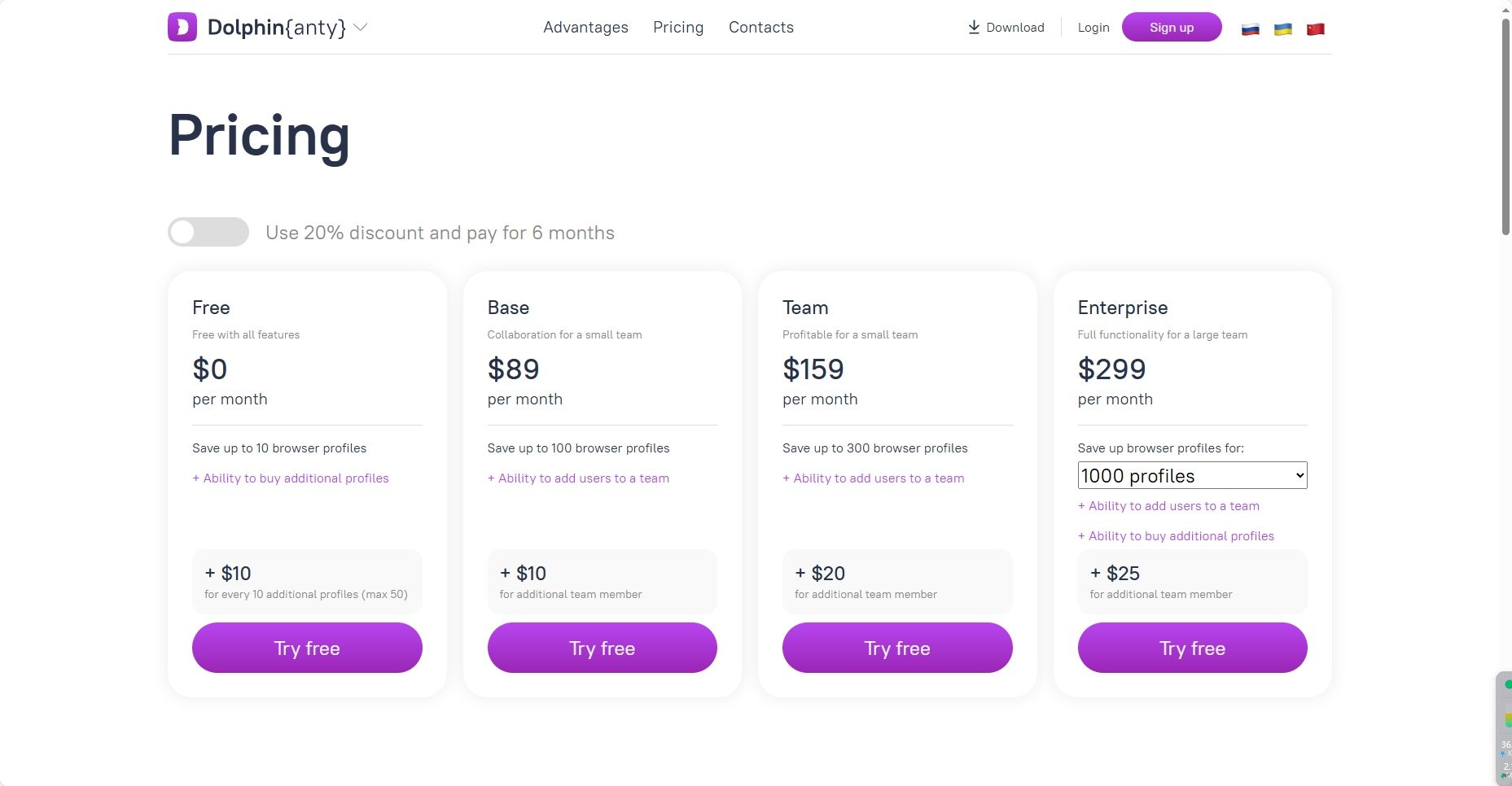 Dolphin 提供免费试用,免费版允许创建最多 10 个浏览器配置文件,预算有限时还可花费 10 美元购买额外 10 个配置文件,最多可拥有 50 个配置文件;此外它还有普通版、团队版和专业版套餐方案,这些套餐功能无区别,但如需团队协作需购买额外团队成员席位且团队版与专业版席位价格不同,对浏览器配置文件有更多需求时专业版是唯一选择,因其可提供 1000 到 10000 个配置文件不等的选择,若需超过 10000 个配置文件则要联系 Dolphin 团队获取定制套餐方案,同时购买六个月套餐可享受 20%折扣。