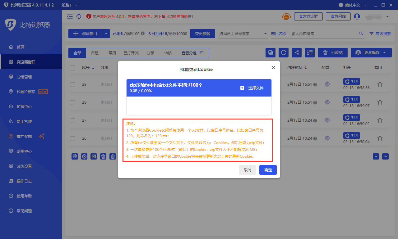 3. 一次最多更新100个txt格式(窗口)的Cookie.zip文件大小不能超过20MB;